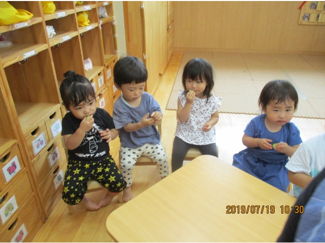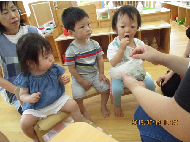 きゅうりが苦手な子も、1口パクっと食べると、美味しさがわかったのか、パクパクと沢山食べる姿が多く見られました♡♡また、きゅうりの味が苦手な子も、塩味のきゅうりなら、パクパク食べる姿もあり、食育活動の素晴らしさを、改めて感じることが出来ました(#^^#)