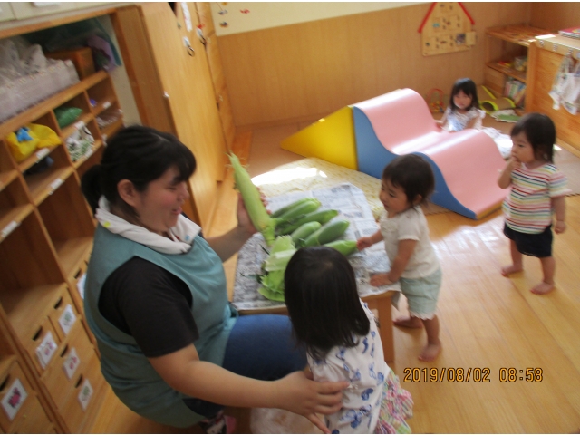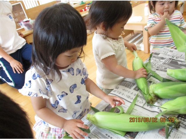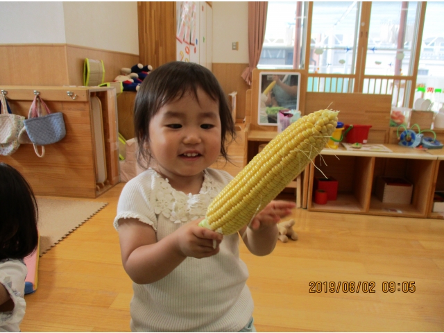 保育者がとうもろこしを室内に持ってくると、「なになに?」と興味津々の子ども達。