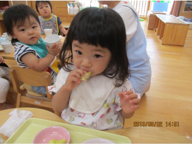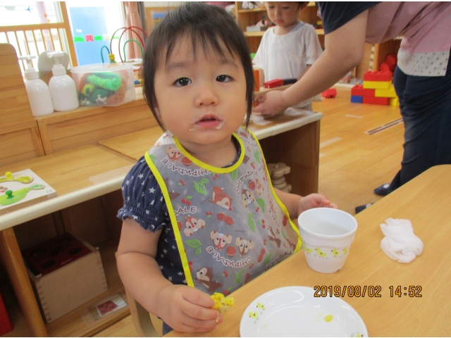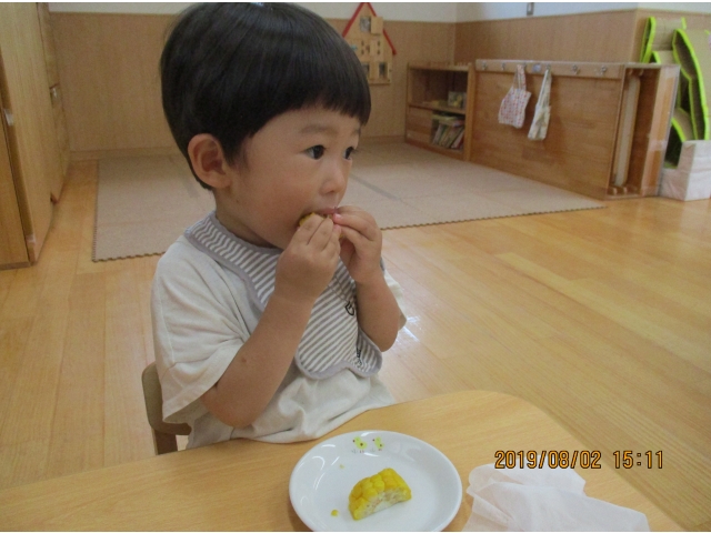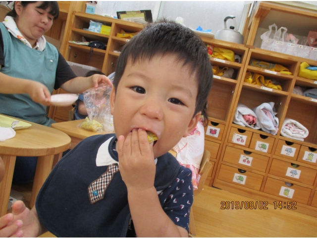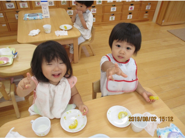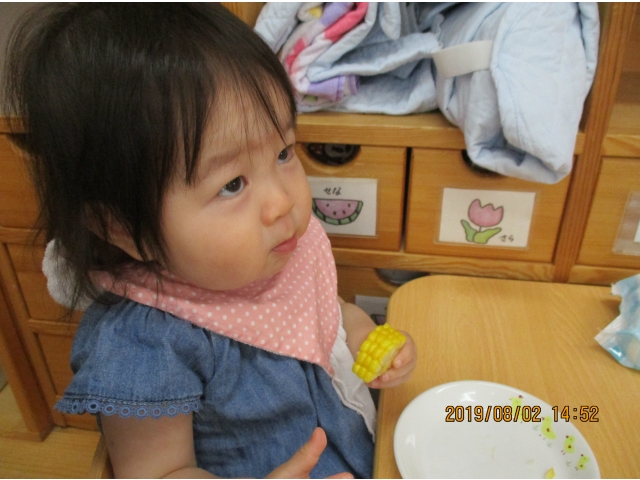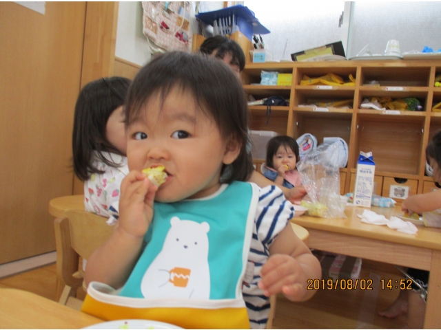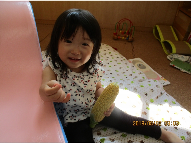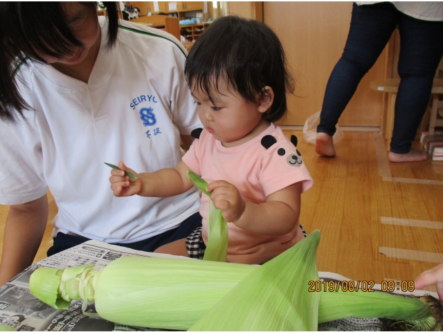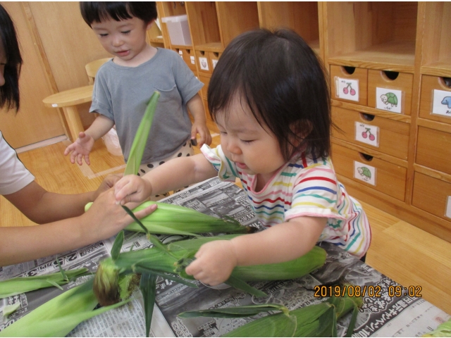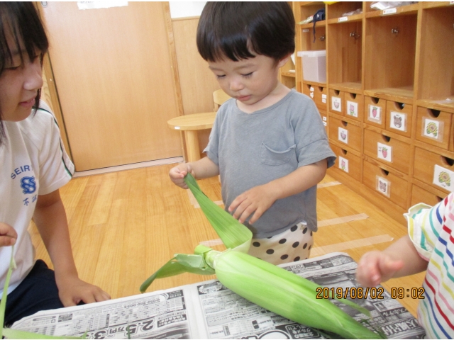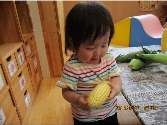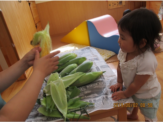 子ども達は、皮つきのとうもろこしを見ても、まだ何かはハッキリと分かっておらず、保育者が1本見本で皮をむくと、中から出てきたものを見て、「あっ!コーン!!」と大喜びしていました☆