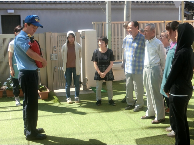 中村消防署員の監修の基、町内のおじいさんやおばあさんも大勢来て下さり、避難誘導や消火器の使い方の訓練もしました。