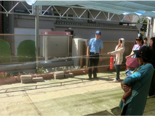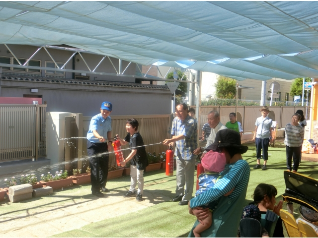 少し暑くなりましたがその後、訓練用の水消火器を使って、近所の方から職員の全員が的に向かって消火の練習もしました。水が的に当たると「わあ~!」という歓声と拍手が子どもたちから起こり、無事に鎮火いたしました🙋