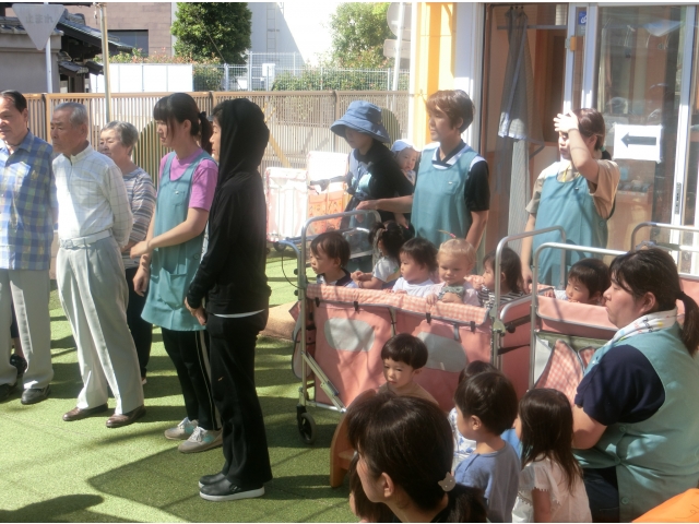 0歳児ひよこさんは、職員におんぶされ、1歳児りすさんは、全員避難車に乗り、2歳児うさぎさんたちは、近所の方々に靴を履かせてもらったり防災ヘルメットをかぶせてもらい隣の避難所まで手を繋いで連れて行ってもらいました。