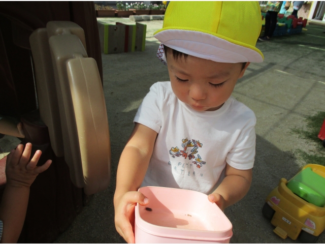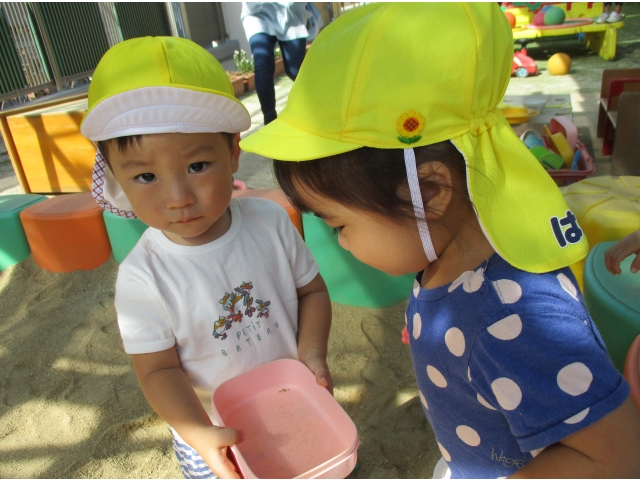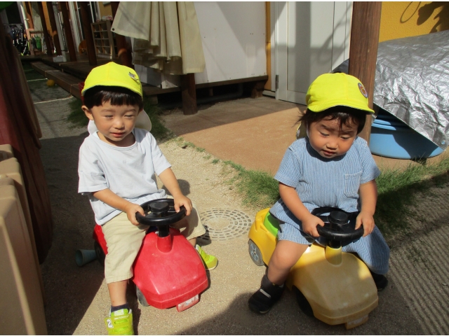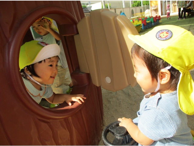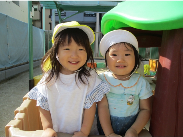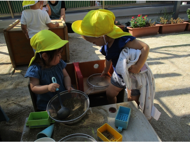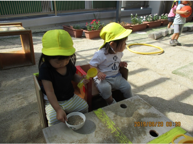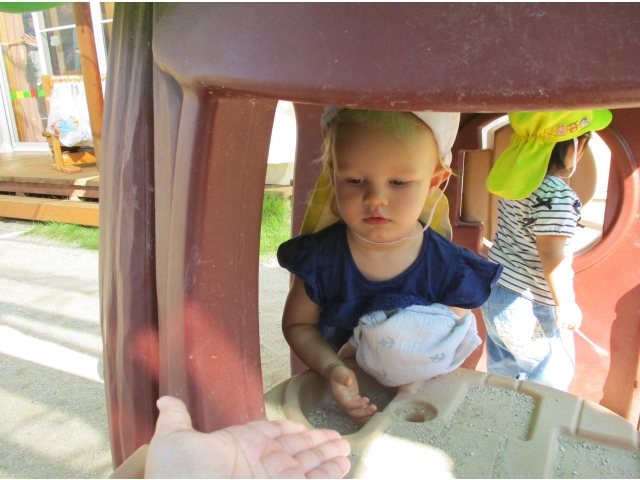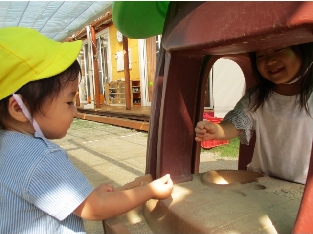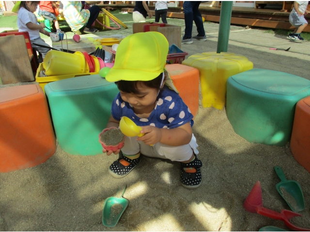 プールも終わり、登園してすぐに、園庭あそびを楽しむ子どもたち。だいぶ過ごしやすくなり、子ども達は、園庭を駆け回ったり、砂場で山を作ったり、カントリーハウスでお店屋さんごっこをしたり、元気いっぱいに過ごしています!