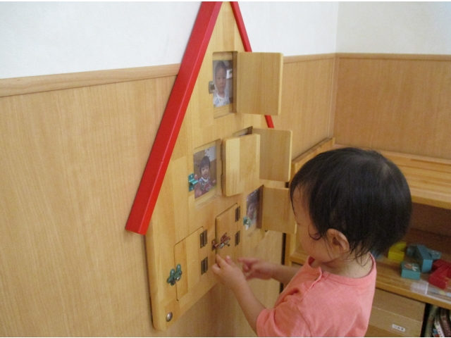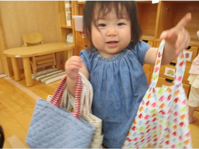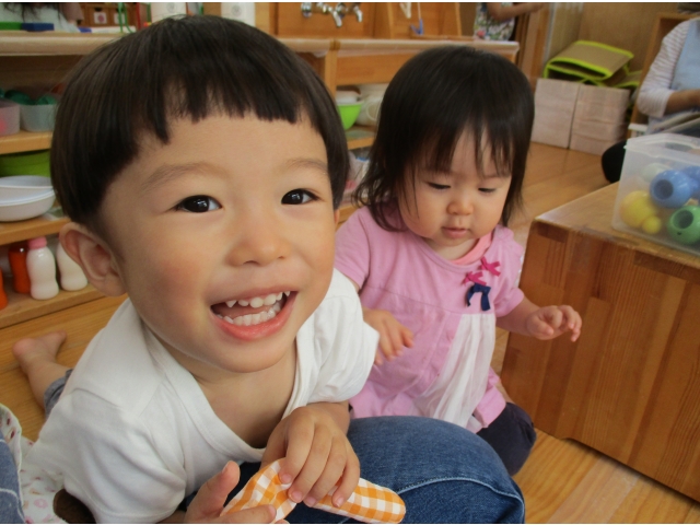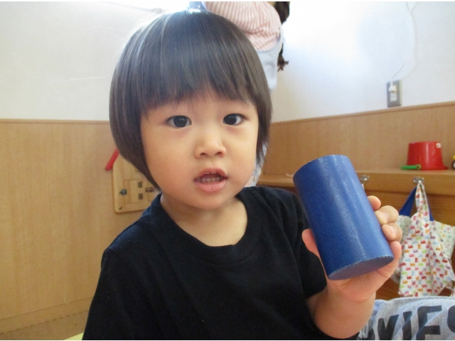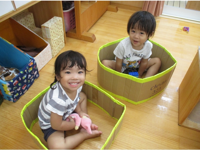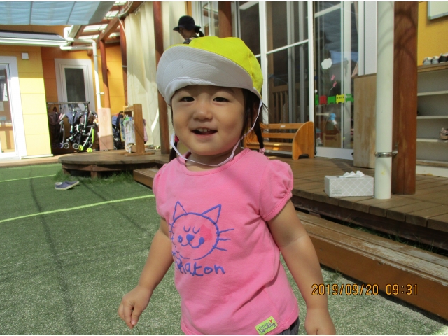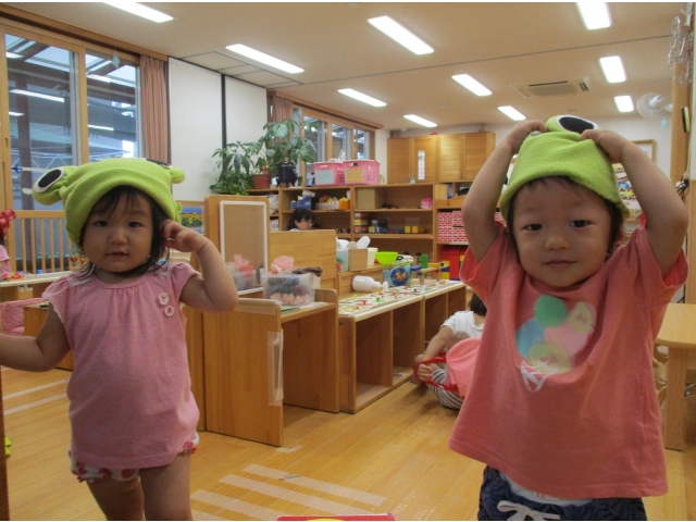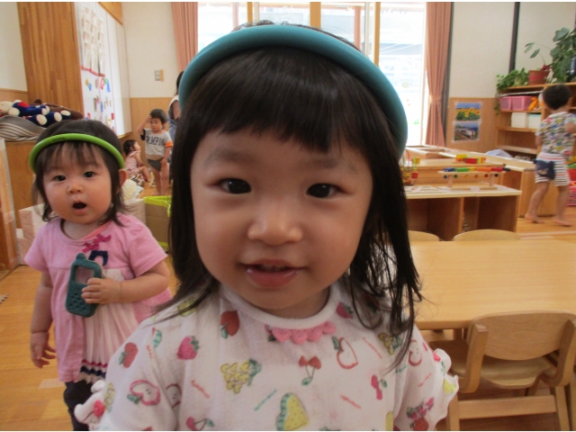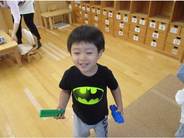 室内では、被り物を被ったり、ブロックを組み立てて電車などを作ったり…ウレタンマットで体を動かして遊ぶ子もいます(#^^#)