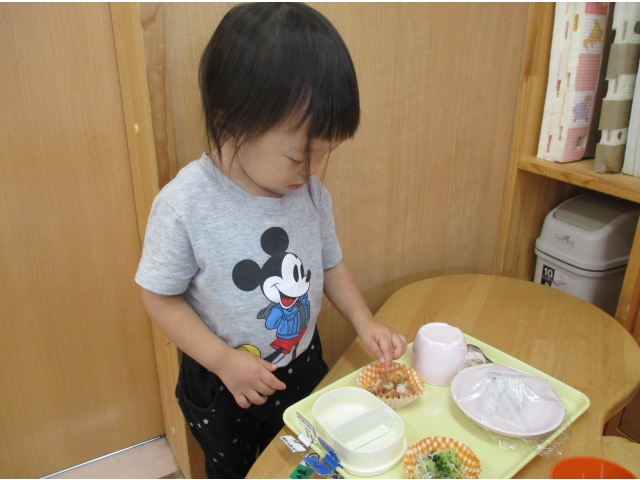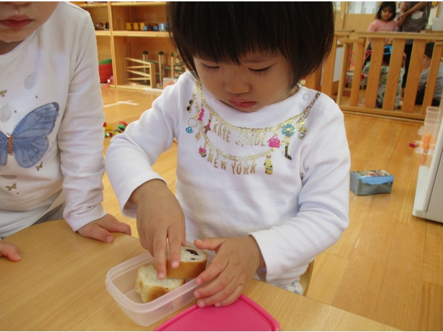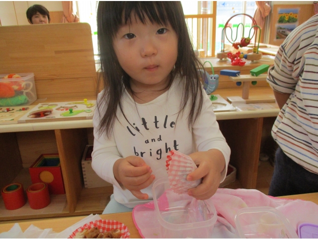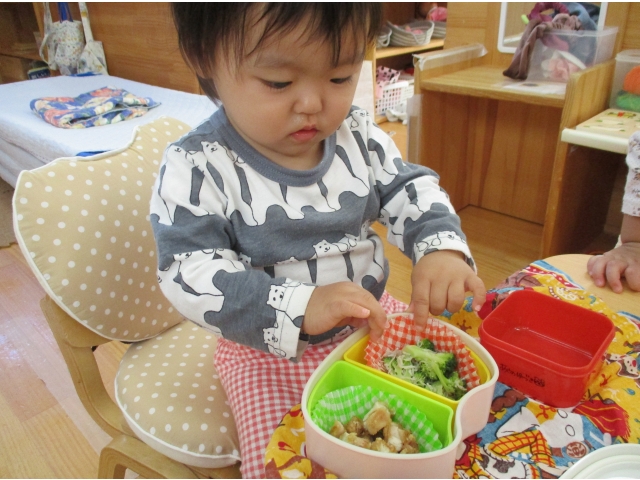 数日前から、『おべんとう』の手遊びや絵本を取り入れ、”給食をお弁当に詰めて食べる”ということを伝えてあったため、子ども達はこの日を、待ち遠しくしていました‼‼