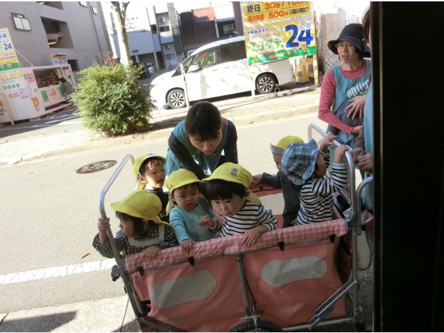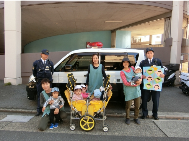 11月になり、交番を訪問しました♬交番までの道のりは、園庭とは違った雰囲気で、すれ違う自転車や自動車、家々の様子に興味津々のひよこ組さん達です。交番では、お巡りさんからのお話を聞き、最後にパトカーの前で記念撮影をしました!