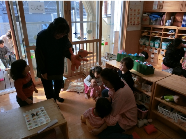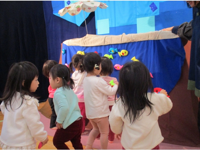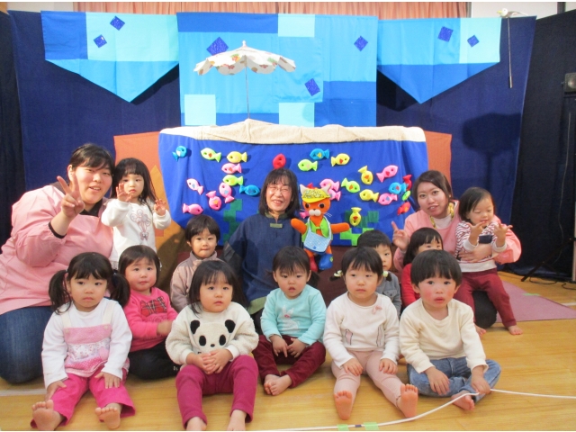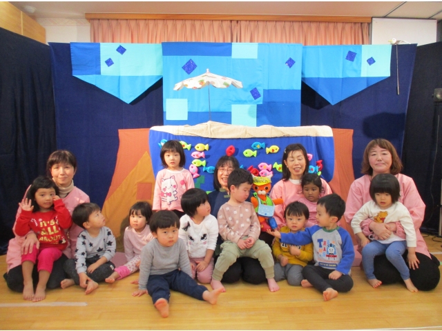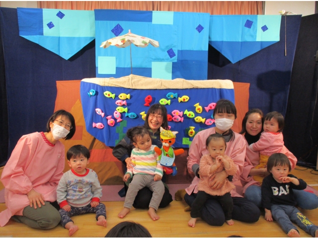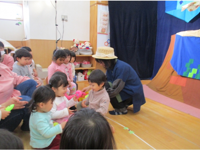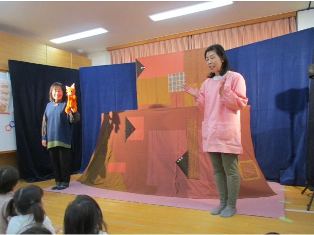 今日は、むすび座の方が来てくださり、人形劇を観せていただき