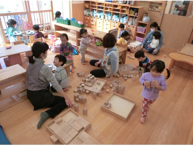 今日は、うさぎ組とりす組の室内を両方使い、積み木遊びを行いました。どちらの室内でも遊べるため、子ども達は好きなところを選び、積み木遊びを楽しんでいました!(^^)!また、うさぎ組のお兄さんお姉さんが、りす組の子と一緒に遊ぶ姿もあり、りす組の子ども達も、とっても嬉しそうに遊んでいました!(^^)!