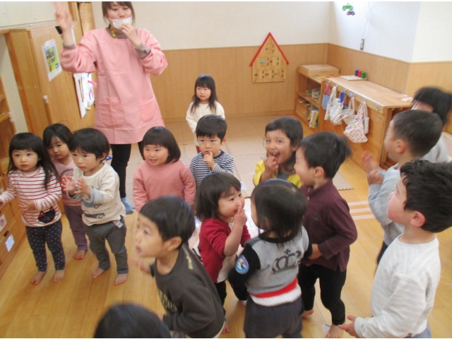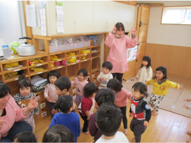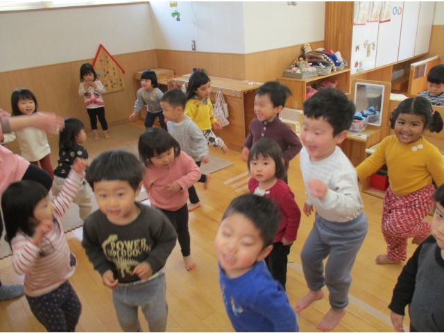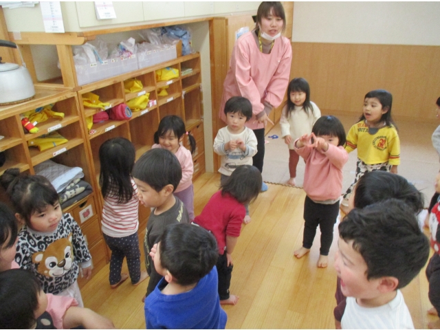 給食を準備している間うさぎ組さんの呼びかけで皆でりす組でエビカニクスを踊りました。(^^♪