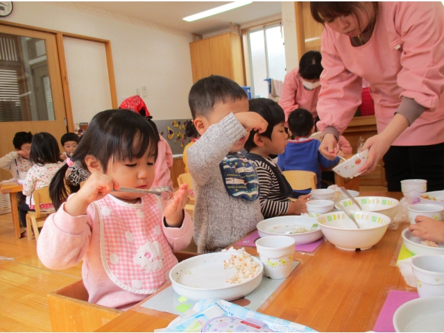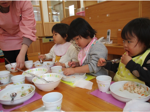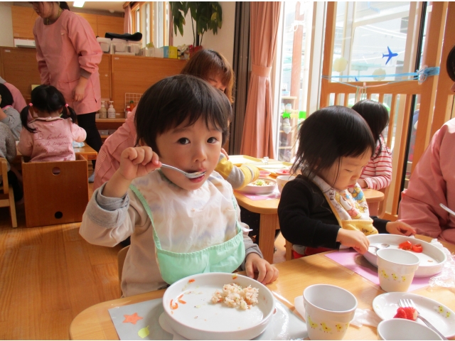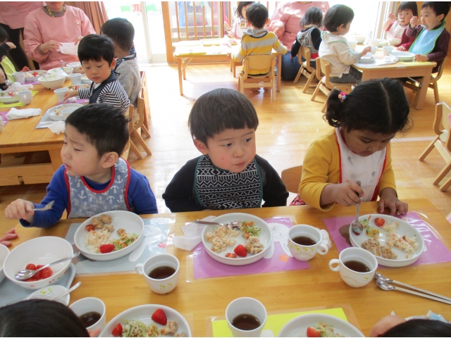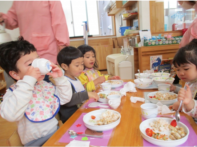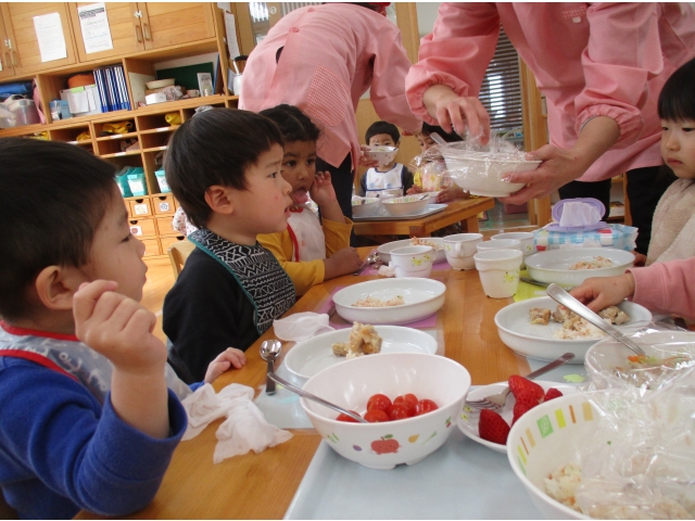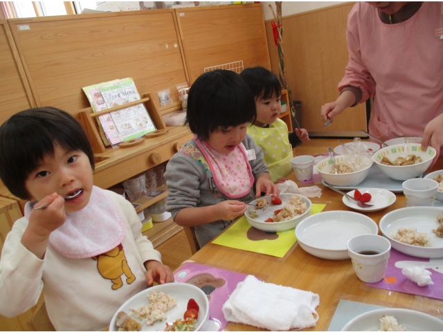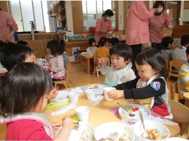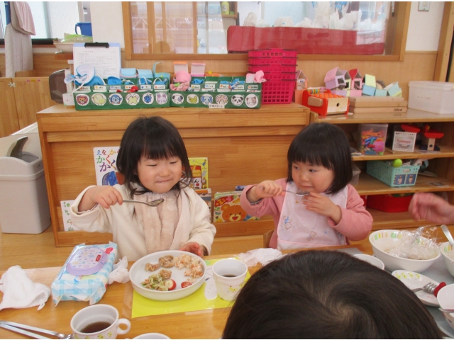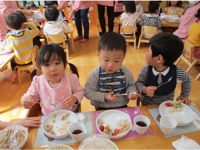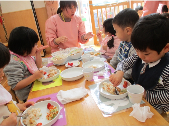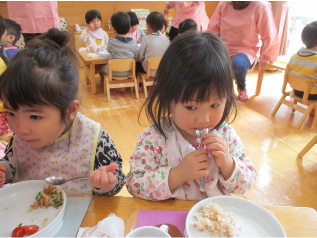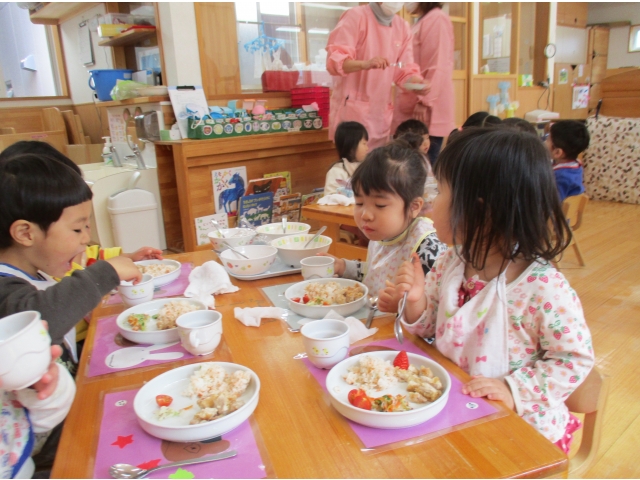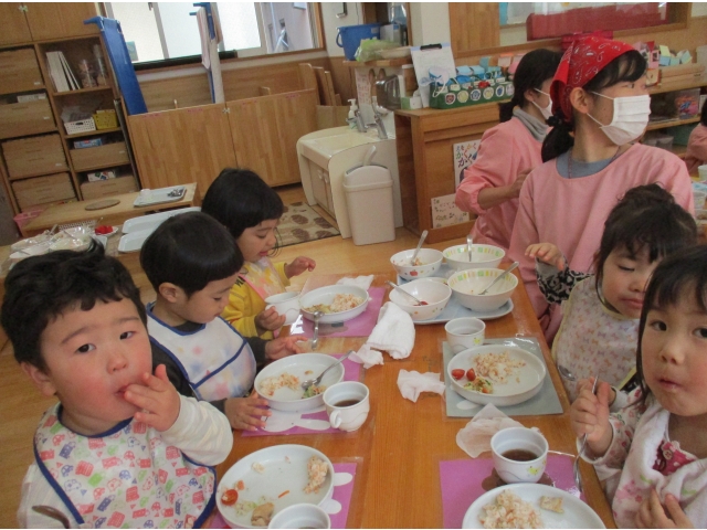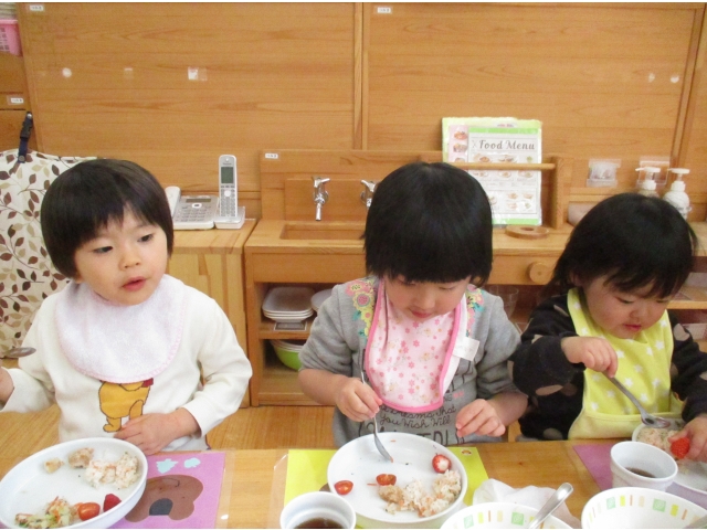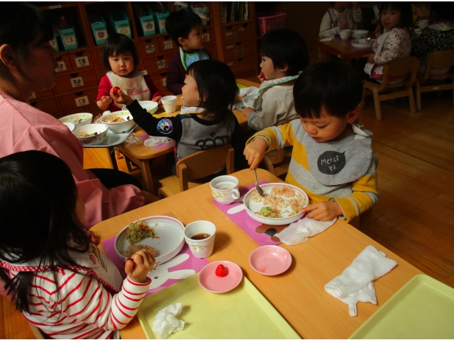 うさぎ組さんとりす組さんが同じテーブルで一緒に「いただきます」をして食べ始めました。「みんなでおいしいね」と話をして交流を楽しんでいました。