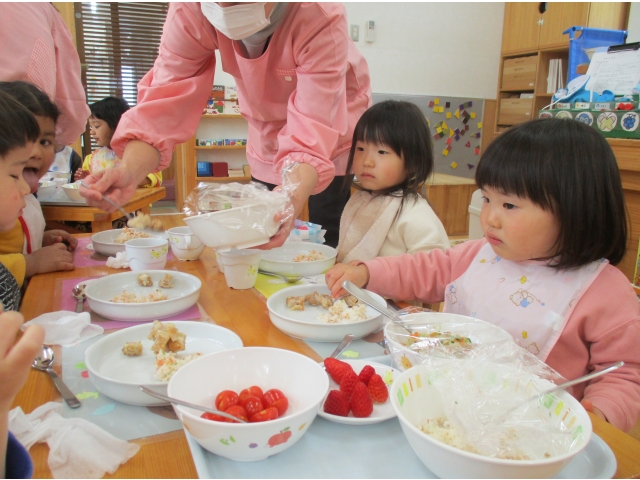みんなの大好きな鶏のから揚げ、鮭ごはん、ゆかりあえ、プチトマト、いちごのメニューです。