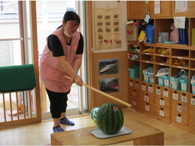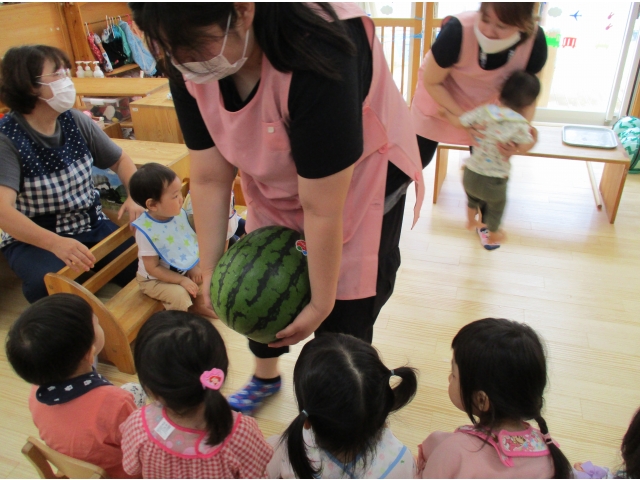 ホールに大きなスイカが置いてあると、子ども達は「スイカだーーーー‼」と大興奮!
