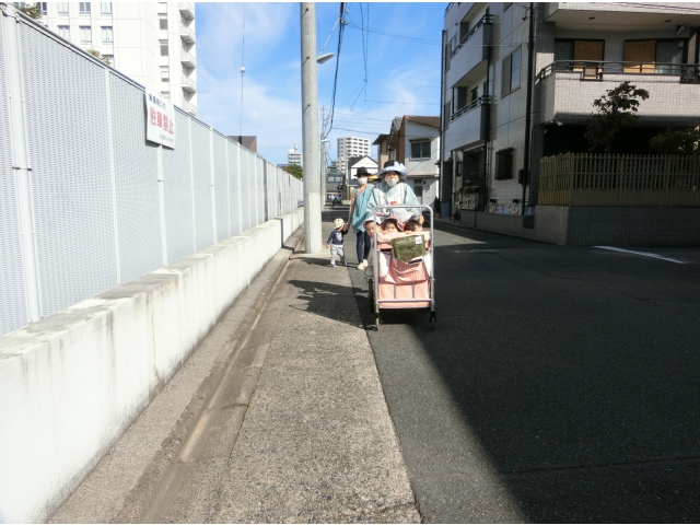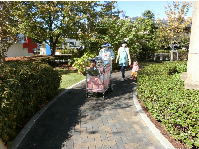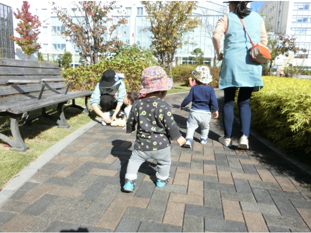 先日は、中村日赤病院の敷地内へお散歩に出かけましたよ。いつもの園庭とは違い、すれ違うタクシーや自転車を目で追ったり、葉っぱをちぎってみたり、かけ回ってみたりと、刺激いっぱいのお散歩を満喫しました。