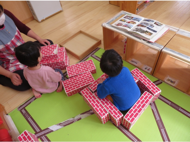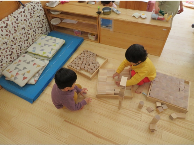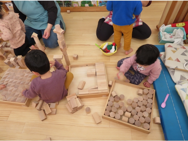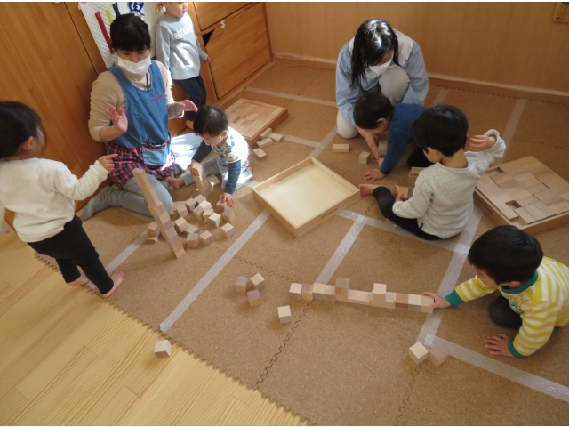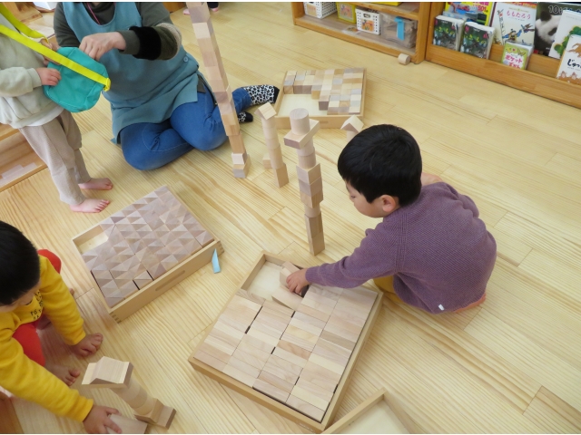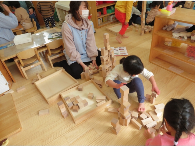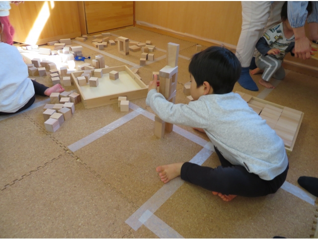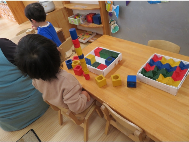 集中して一人でどんどん積んでみたり、保育士と一緒に