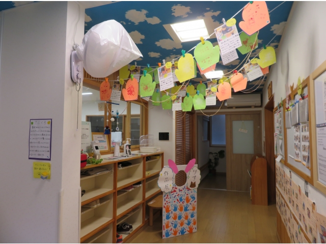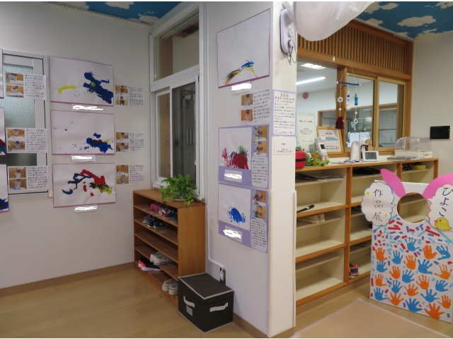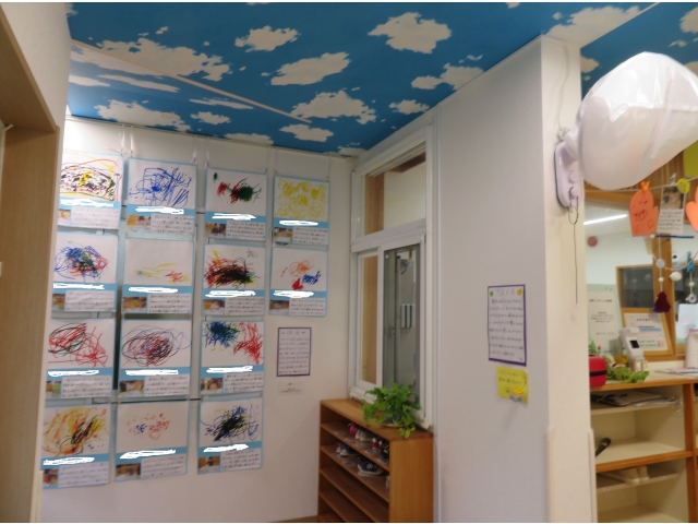 また、展示は0歳→1歳→2歳の順で飾ったので、保護者の方々は他クラスのお子さんの作品も見ながら、“こんな小さい時もあったな”“大きくなったな”“年齢が上がったらこんな事も出来るようになるんだな”など、様々な事を感じて頂ける機会にもなったのではないでしょうか(*^▽^*)