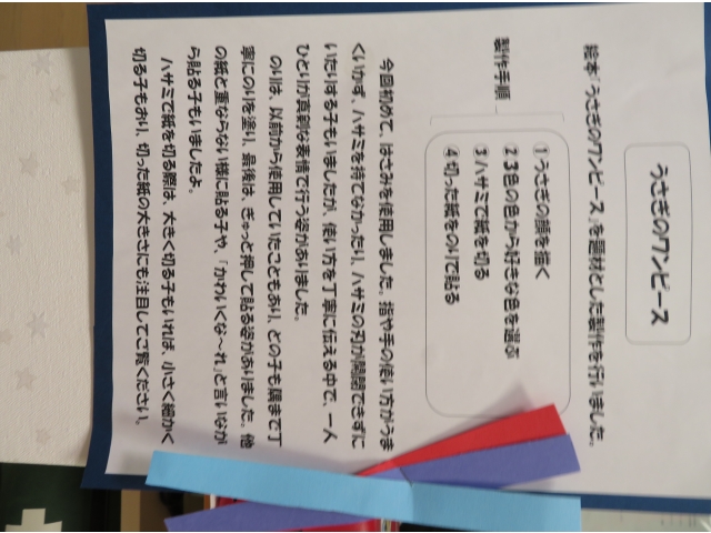 また、絵本「うさぎのワンピース」をモチーフにうさぎの顔を描いたり、はさみの1回切りにチャレンジした物をのり付けして素敵なお洋服を作りました✨