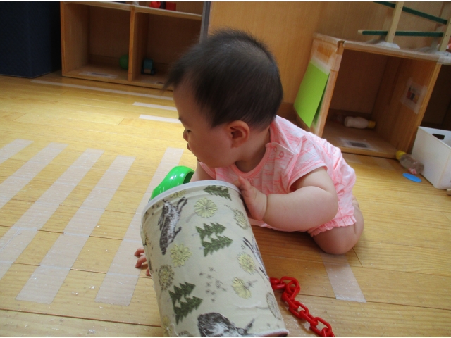 子ども達は少しづつ、保育園や保育者にも慣れ、興味のある玩具に手を伸ばしたり、「ばぁ!」と隠れていたところから、ひょっこり顔を出したり…