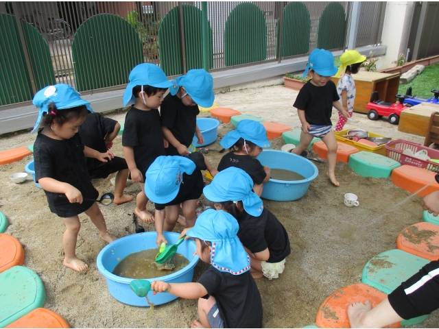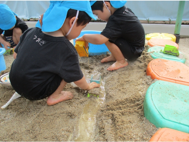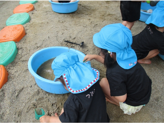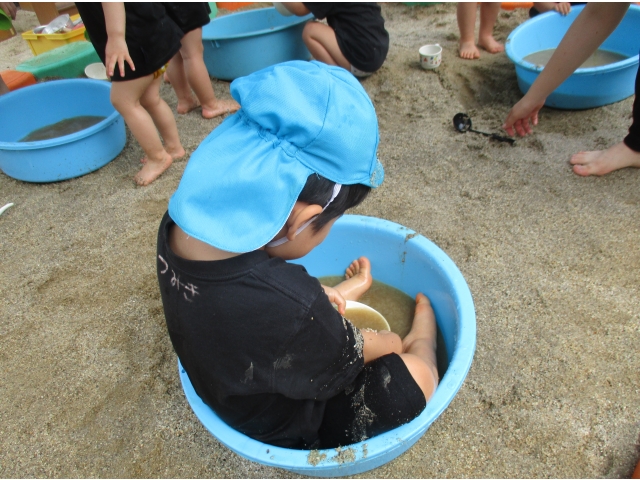 水が入っているタライの中に砂を混ぜ、色の変化を楽しんでいました!