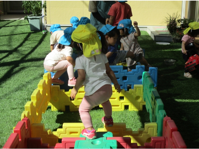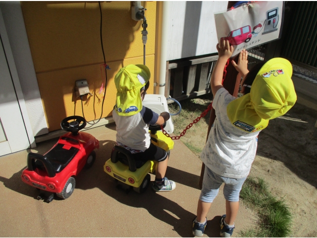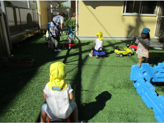 外ではコンビカーを走らせたり、大型遊具の登り下りを楽しみながらたくさん体を動かしています(*^▽^*)