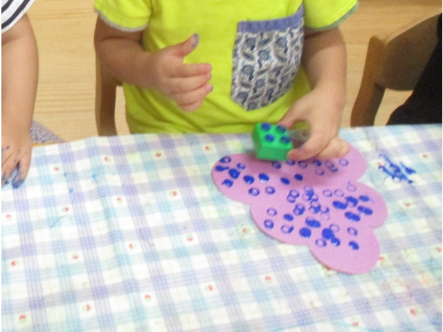 うさぎぐみ(2歳児)はブロックでスタンプ