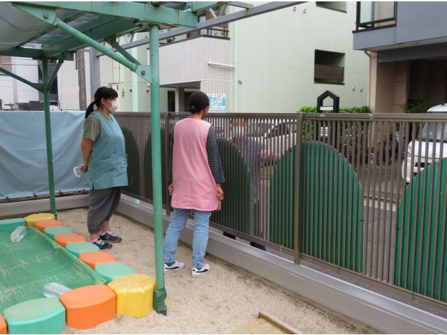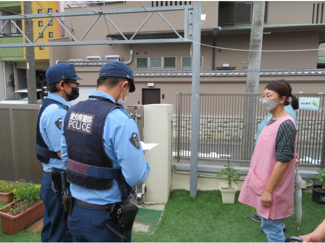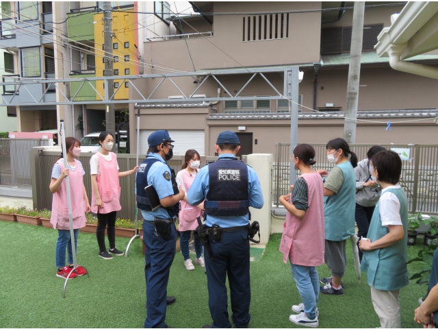 園庭遊び中に不審者が盗撮しているという想定で訓練を行い、今回は初めて中村警察署の方に犯人役をやって頂き、緊張感のある中での訓練でした。