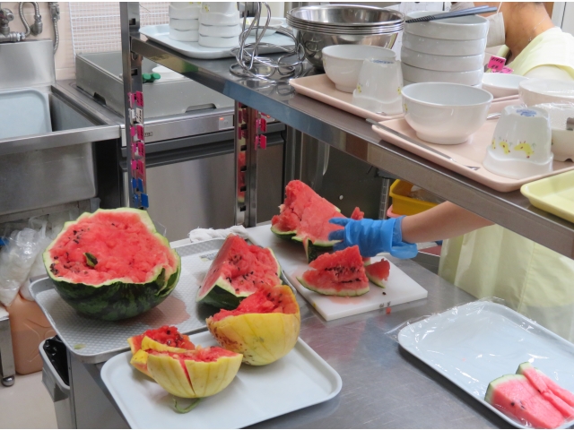 すいかは給食の先生に切ってもらってみんなで美味しく食べました!