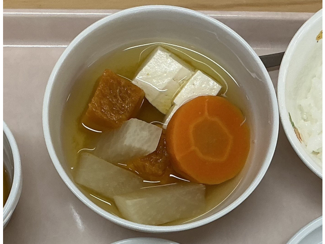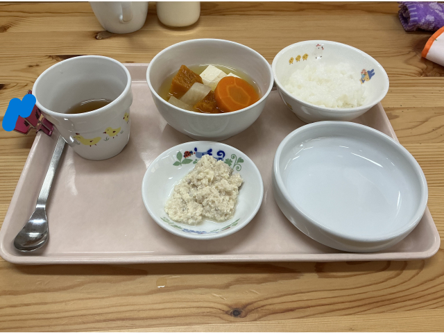 0歳児の離乳食には手づかみ食べの食材として、スープの中ににんじんなどの食材も入っており、かじり取りの練習に繋げています。手で取りやすいよう、立ち上がりが高いお皿を別で用意しています。