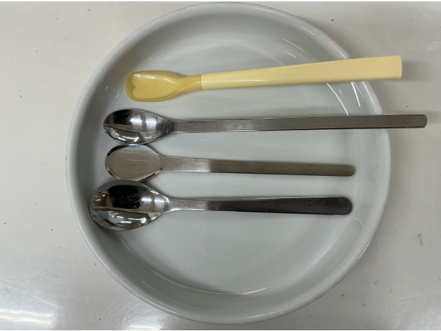 スプーンも先がなだらかな物を使用し、食材が自分で抜き取りやすいようにしています。