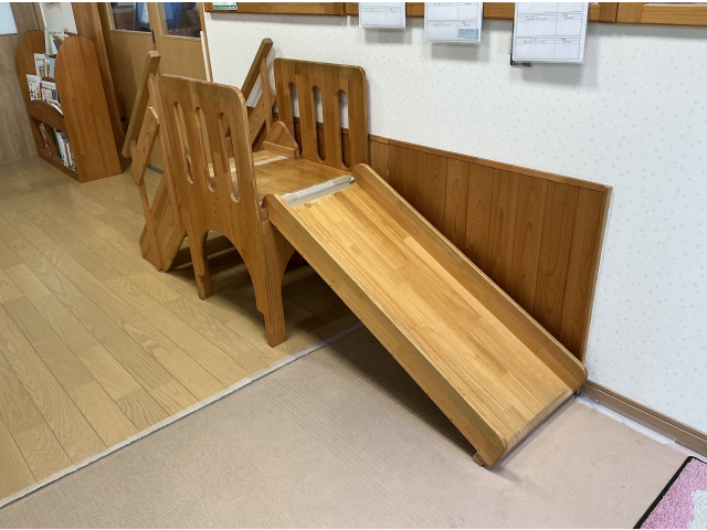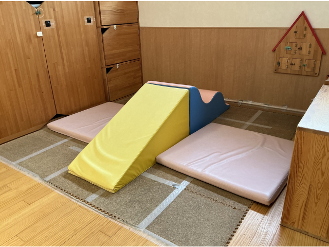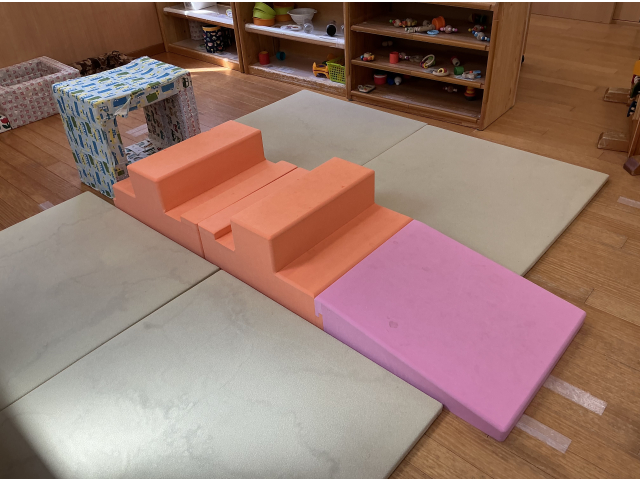 1歳児クラスでは、身体を動かすため、0歳児クラスよりも高いウレタンマットを設置しています。シュ~っと楽しそうに斜面を滑ってくる子も多いですよ!また、斜面だけではなく、身体を動かせる環境も意図的に作るようにしています。