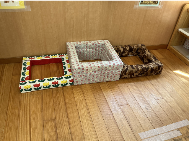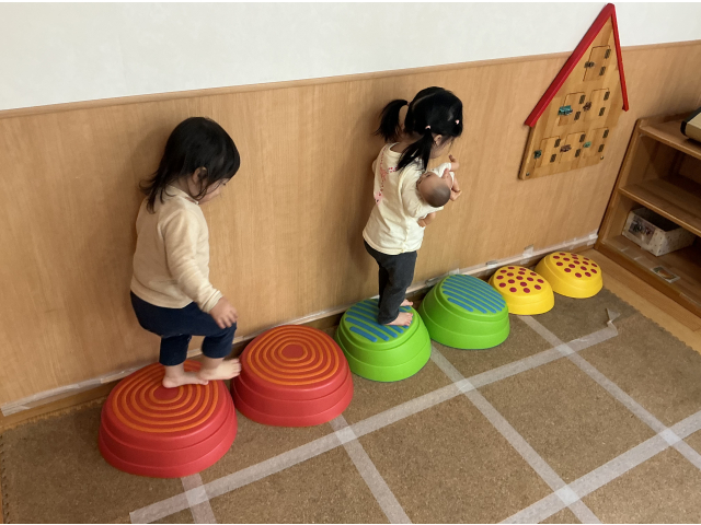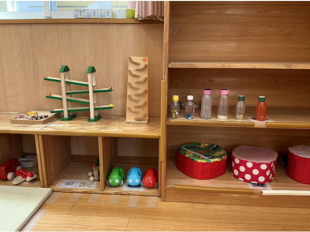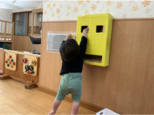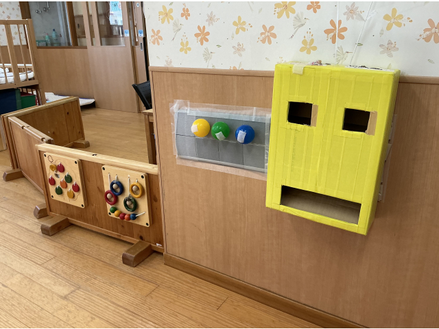0歳児クラスでは月齢を考え、トンネルや斜面・段差など、身体を動かせるスペースを室内中央に設置しています。また、高さの違う出入りできる箱も設置しています。また、クルクルと回るコマや、チェーンリング、保育士手作りの音の鳴る玩具などを棚に設置し、気になる物・好きな物を自分で見つけ、遊べるようにしています。また、絵本コーナー・ゴロンと寝転がれるリラックススペースも設置しています。壁面おもちゃもあり、保育士手作りのポトンと出来る箱も用意しています。これは、子どもたちが肩を使い腕を上にあげる運動を目的として設置しました。