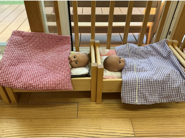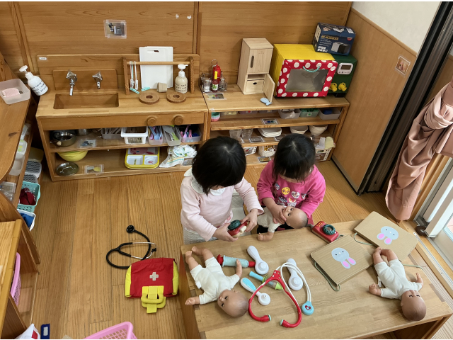 2歳児クラスの紹介です。2歳児クラスでは、人形を使っておむつを替えるなどお世話をしたり、医者になりきって「どこがいたいですか~?」と診察を始めたり、○○役になりきって遊ぶ姿が多くあります。赤ちゃん人形のベットを設置したり、診察ができるよう白衣や聴診器を用意したりと、子どもの遊びや姿から玩具を用意するようにしています。また、WAKU積み木などの机上あそびができるスペースも用意してます。壁面には、磁石で遊べる物もあり、三角形や正方形を組み立て、「おうち!」を作る子も!電車やレゴブロックが好きな子もおり、そのスペースも確保した室内環境にしています。