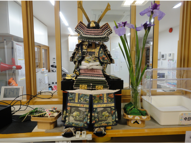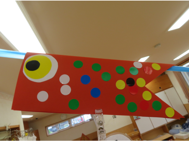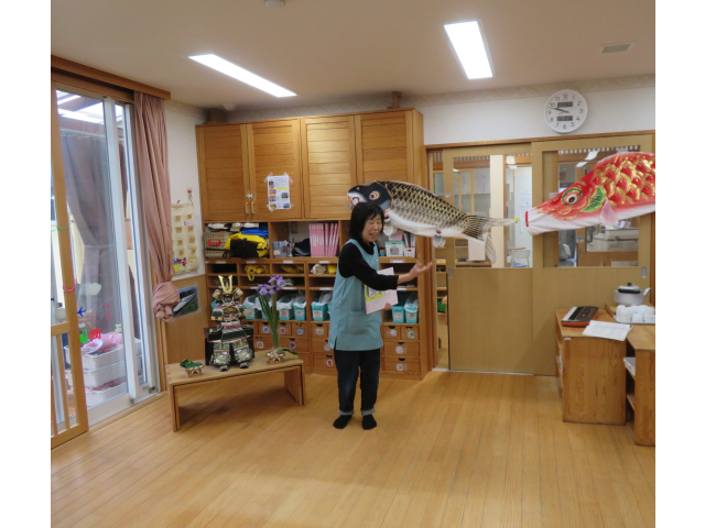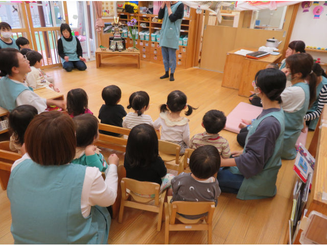 5月2日、子どもの日の集いを行いました。あいにくの雨で園庭で行うことが出来ず、うさぎ組の室内にこいのぼりや五月人形を飾り、行いました。室内にこいのぼりを飾ると、子どもたちは「なになに?」と興味津々。