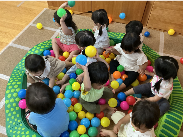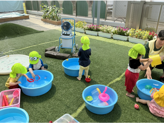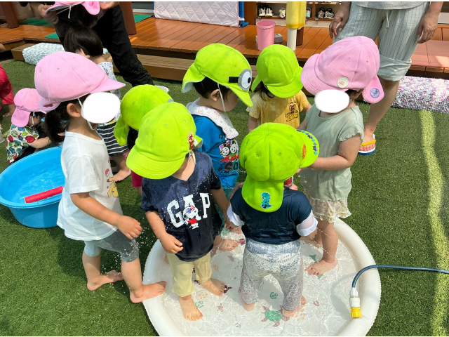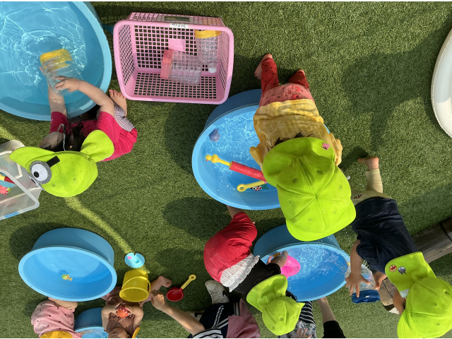 7月から始まった水遊び!8月もみんな元気いっぱい水に触って遊んでいます。おもちゃを片づけたくない!と言う子も、大好きな水遊びの時は・・・、「水遊びいくよー!」と声を掛けると、すぐに片づけて遊ぶ準備に向かっています(^^)♡