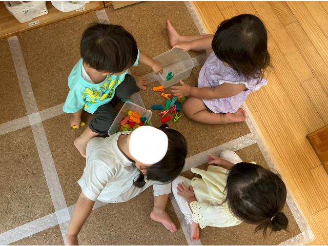 室内では、みんなで「バナナくん体操」や「エビかニックス」等の体操を行ったり、クリップや積み木を使って集中して遊んだりしています。