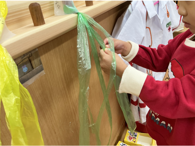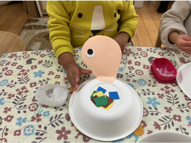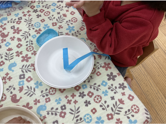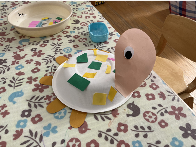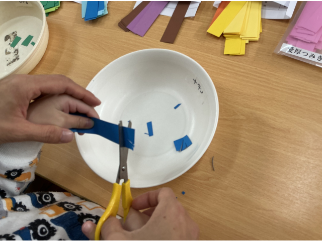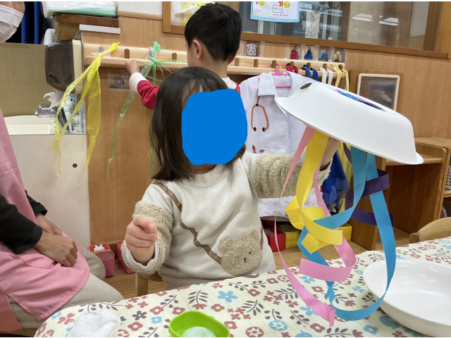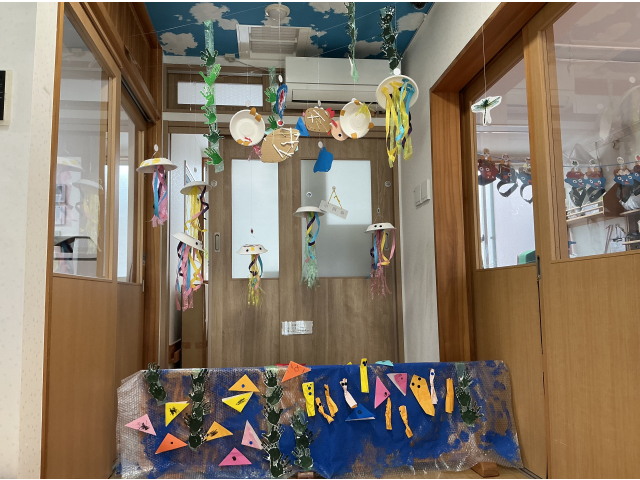 うさぎぐみははさみを使って一回切りしたものを紙皿に貼って飾りつけ、カメを作ったり、ビニールひもを割いてクラゲを作ったりしました。