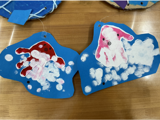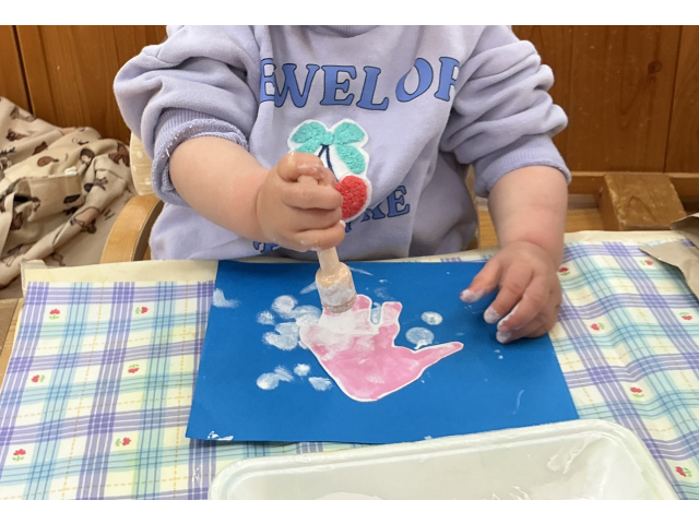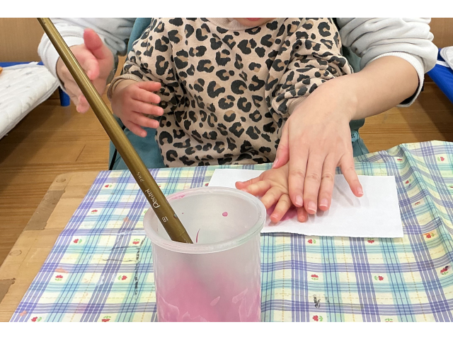 ひよこぐみはピンクと赤の絵の具どちらにするか子どもたちが選び、手形をとって、その上から白のタンポを押してピンクと赤色のタコを作りました。