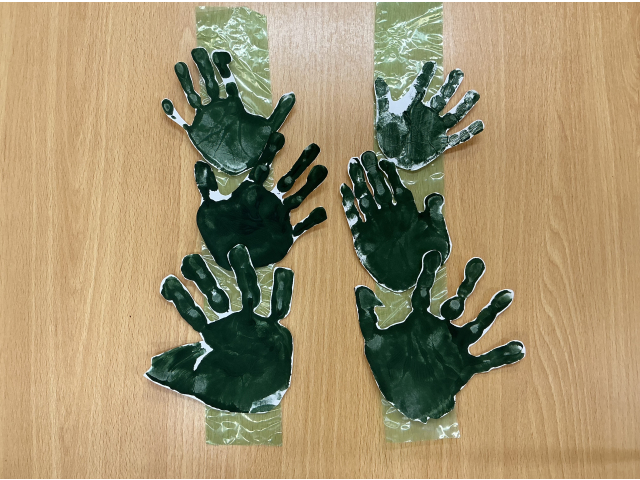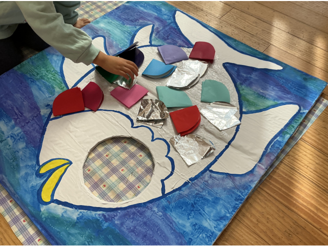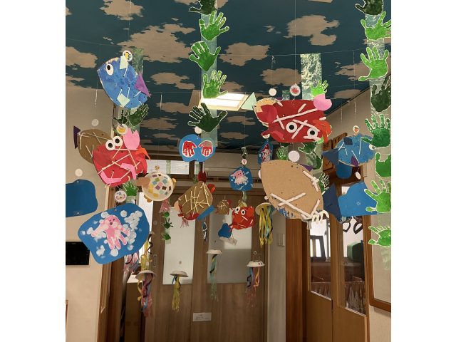 シフォン布と折り紙を貼ってさかなのうろこを作り、手形でワカメを表現しました。