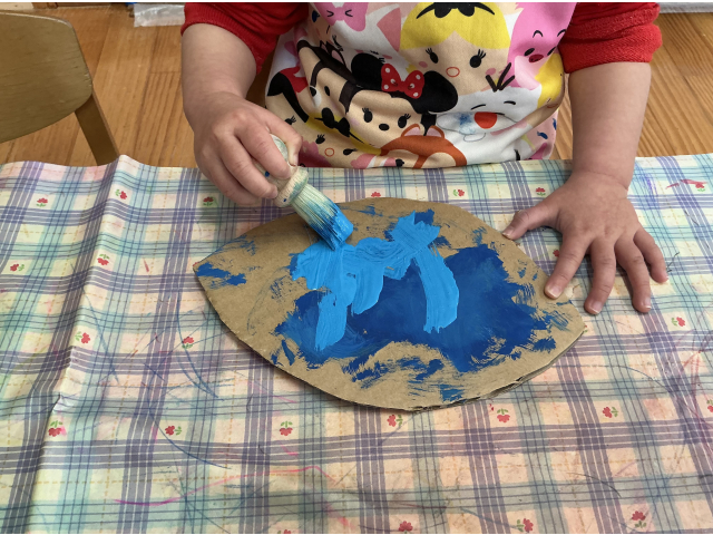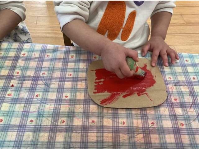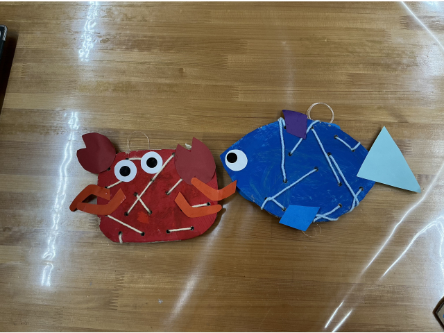 りすぐみは段ボールに赤または青の絵の具を塗り、紐通しやパーツを糊付けして可愛いカニとさかなを作りました。
