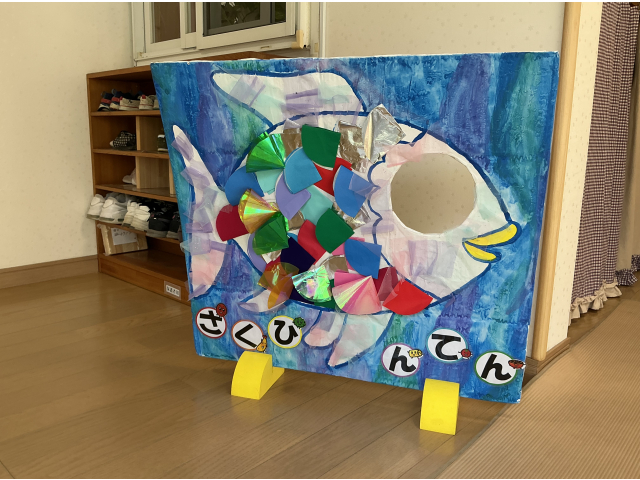 作品展の看板は絵本の「にじいろのさかな」をモチーフにして作りました。