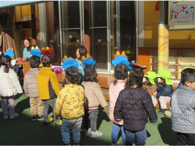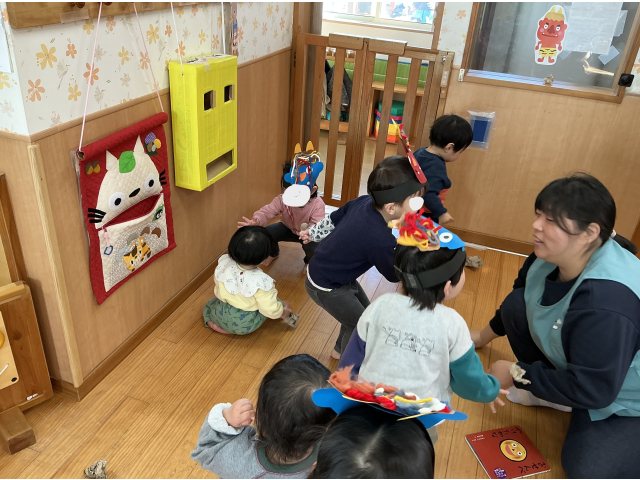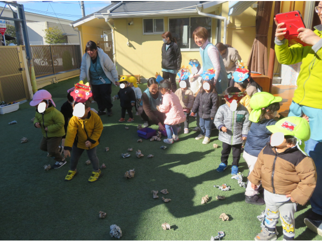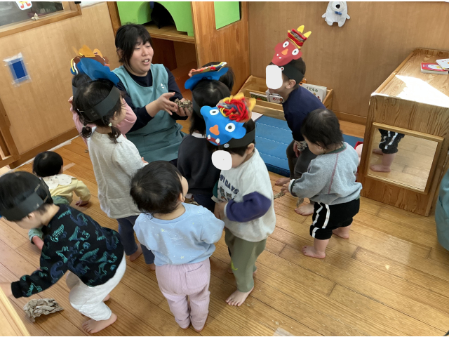 最初は、うさぎ組のかわいい鬼さんたちです。鬼のお面を付けたうさぎ組が、ひよこ組に行きました!みんなで作った、豆を使って「おにはーそと!ふくはーうち!」と言いながら投げています!