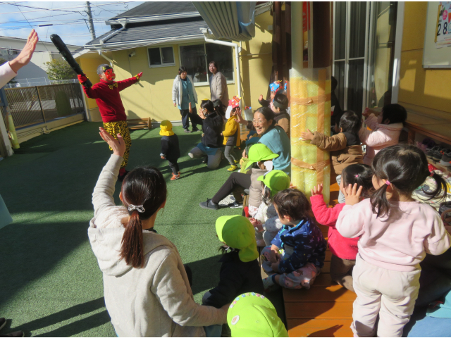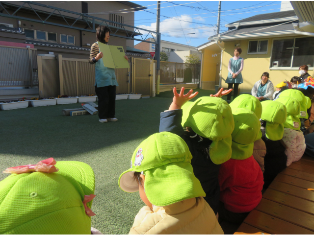 園長先生のお話しでは、鬼の嫌いなヒイラギやイワシの頭がでてきて、「さかな!」と言いながら「うんうん」と頷いて聞いている子も見られました。