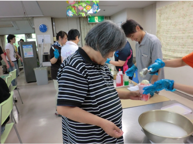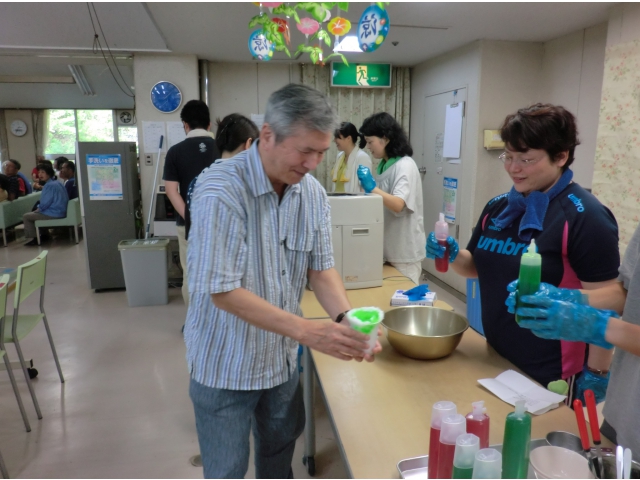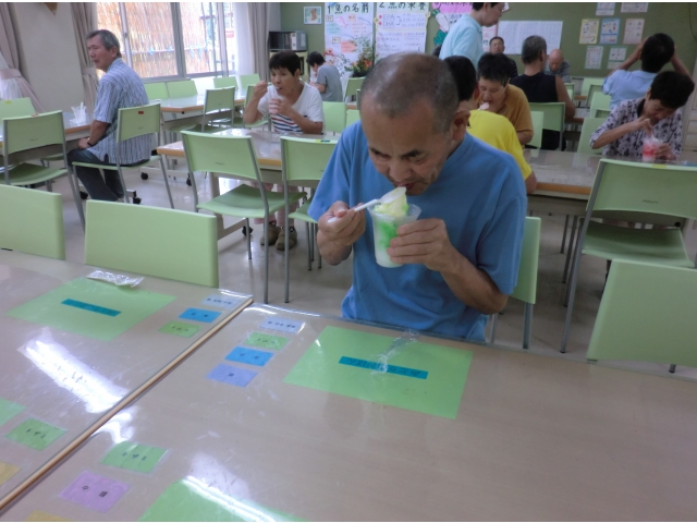 「私、いちごにする!」「俺はメロンがいいなぁ!!」 蒸し暑い、日本の夏。冷たいおやつが最高☆ 利用者様のお顔は、始終、ニコニコ笑顔でした(8分音符)