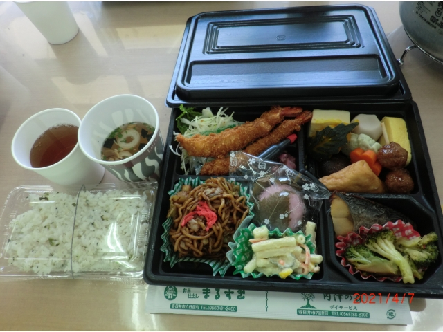 「桜の下でご飯を食べたい」との声が多く聞かれましたが、前日の雨によりグランドの状態が悪いため食堂にてお弁当タイムとなりました。
