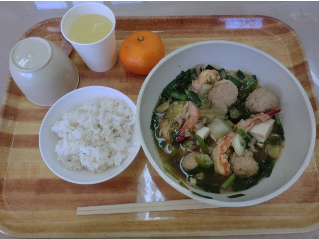 本日のメニューはちゃんこ鍋!海老や肉団子がたっぷり入ってとてもいい匂い。