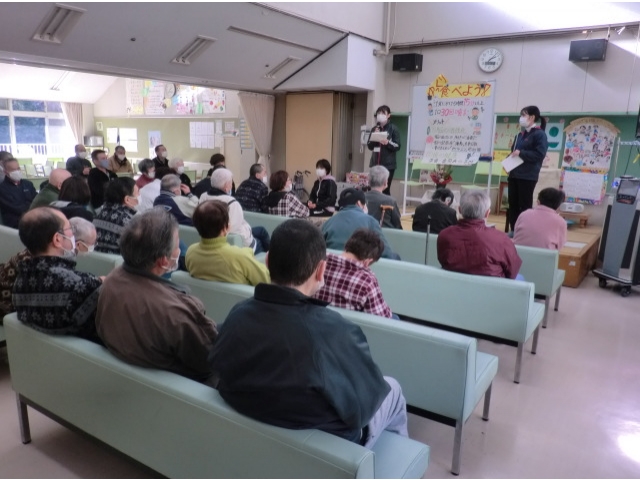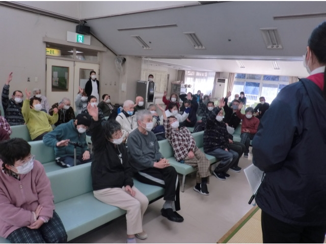 1月7日から名古屋学芸大学の学生さんが、栄養士実習に来ていました。最終日に利用者様へ発表会を実施しました。テーマは「ゆっくり食べよう」。1回の食事時間や、噛む回数をクイズ形式で勉強しました。