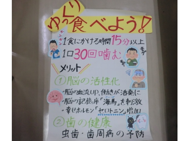 実習生は明知寮の利用者様の食べる速さにビックリしたそうです。よく噛んでゆっくり安全に食べられるように意識するきっかけになると良いですね。