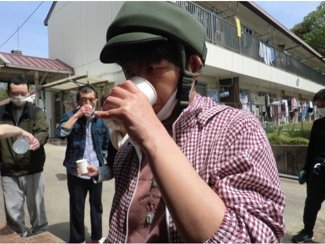 側溝には秋と見間違うくらいたくさんの落ち葉があり、掻きだすのも一苦労…事務所職員も応援に駆け付け、皆で落ち葉を集めます。