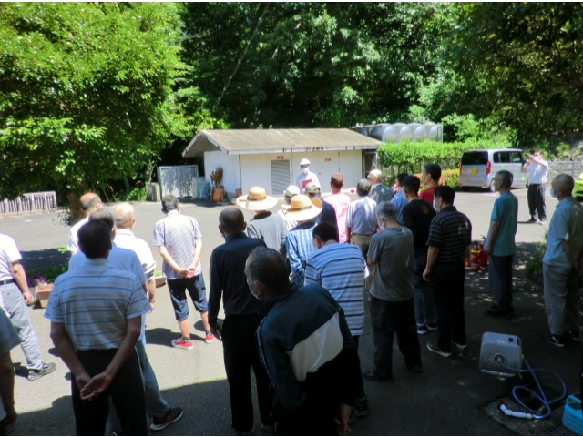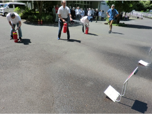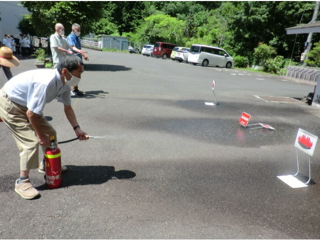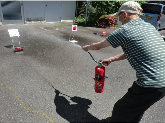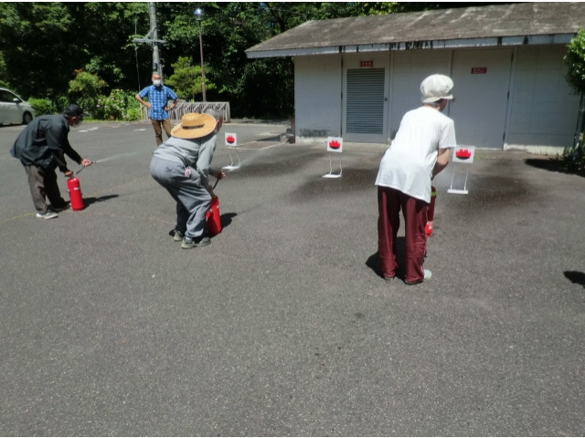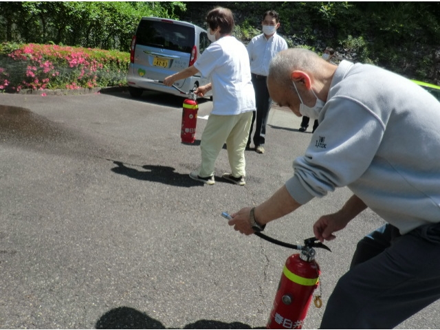 6月に入り、毎年恒例となった消火訓練を実施しました。 今年もコロナ対策のため坂下北保育園の園児さんの招待はできず、施設の利用者と職員だけで水消火器での訓練のみとなりました。 それでも好天に恵まれた中、利用者の皆様は元気よく訓練に参加されていました。