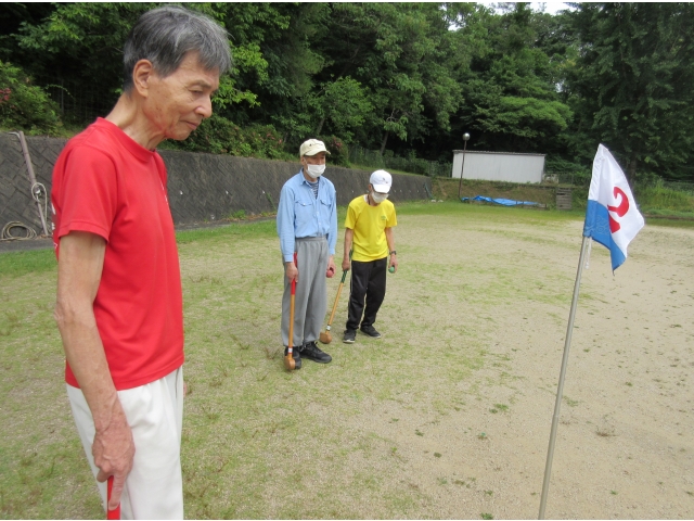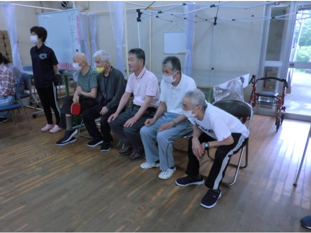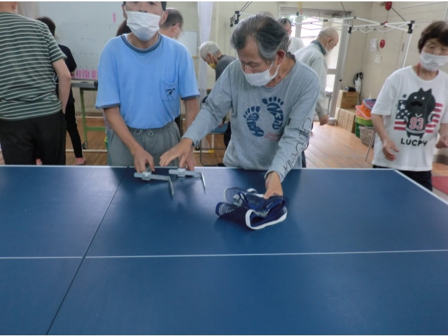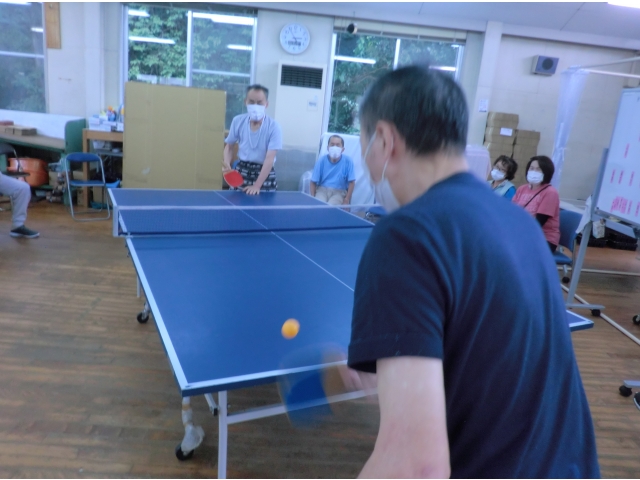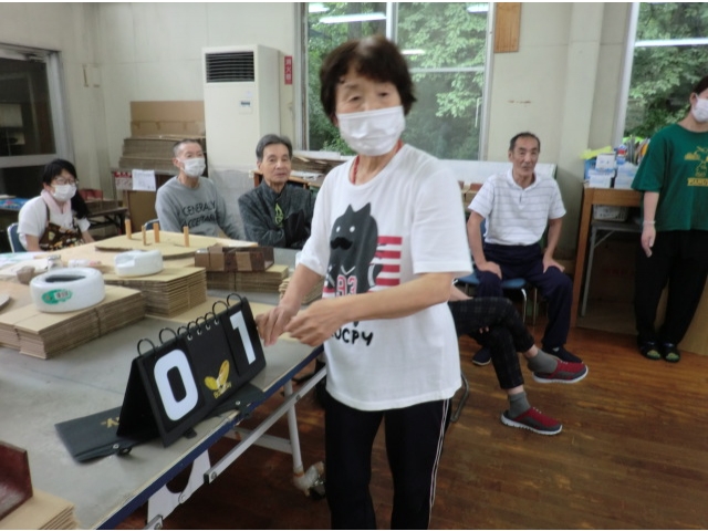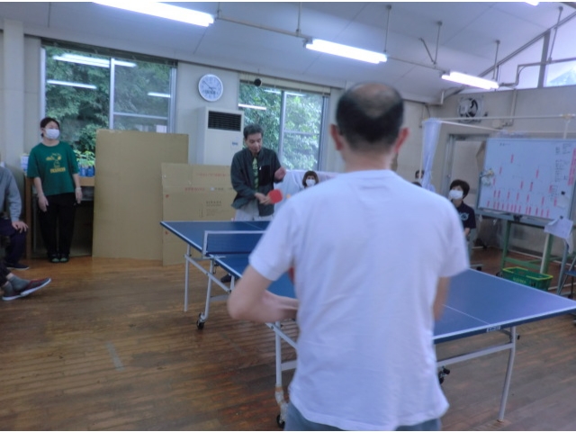 明知寮では、クラブ活動として、利用者様にスポーツクラブと文化クラブを選択してもらい、スポーツクラブを希望された方は、月曜日に屋外でグラウンドゴルフ等を楽しまれています。雨でグラウンドがぬかるみ、使用できない時は、スポーツクラブ参加者は、就労室にて卓球を行っています。