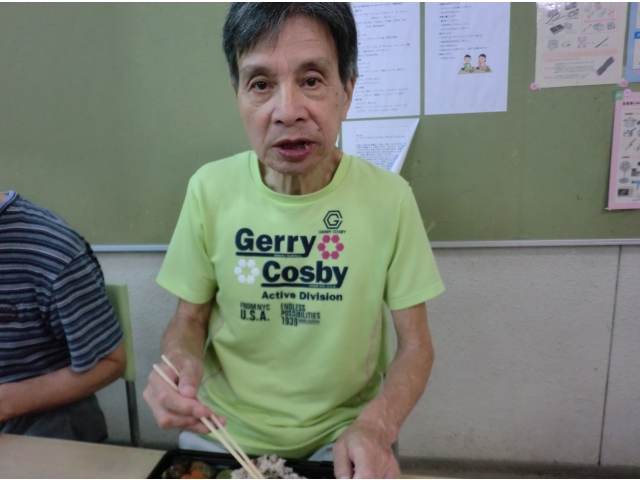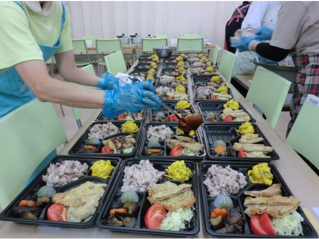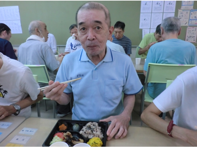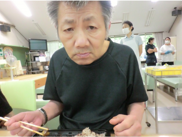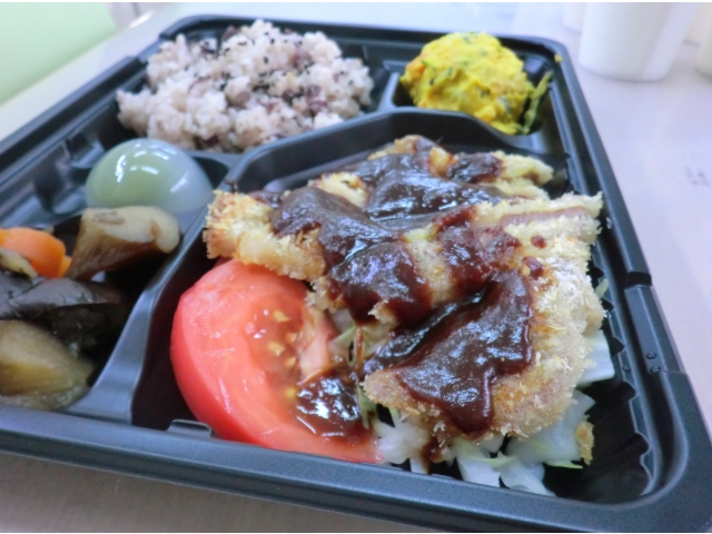本日のメニューは、赤飯、味噌カツ、茄子の煮物、南瓜サラダ、水まんじゅう、オレンジジュースです。利用者の皆さんが大好きな味噌カツですが、このところの物価上昇の影響により揚油が高騰しており、本日は「焼きカツ」として調理しました(^^;